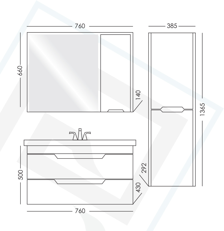 Ayna: G: 760 | Y: 660 | D: 140 Dolap: G: 385 | Y: 1365 | D: 292 Alt Dolap: G: 760 | Y: 550 | D: 430 Lavabo: 000 x 000